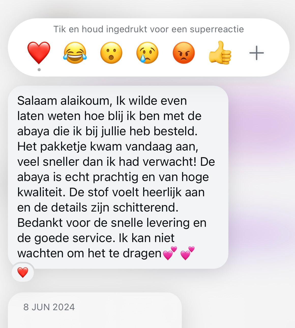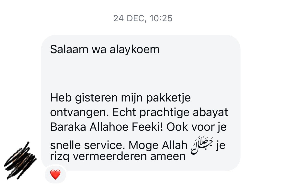 Salaam alaikoum, Ik wilde even laten weten hoe blij ik ben met de abaya die ik bij jullie heb besteld. Het pakketje kwam vandaag aan, veel sneller dan ik had verwacht. De abaya is echt prachtig en van hoge kwaliteit. De stof voelt heerlijk aan en de details zijn schitterend. Bedankt voor de snelle levering en de goede service. Ik kan niet wachten om het te dragen.