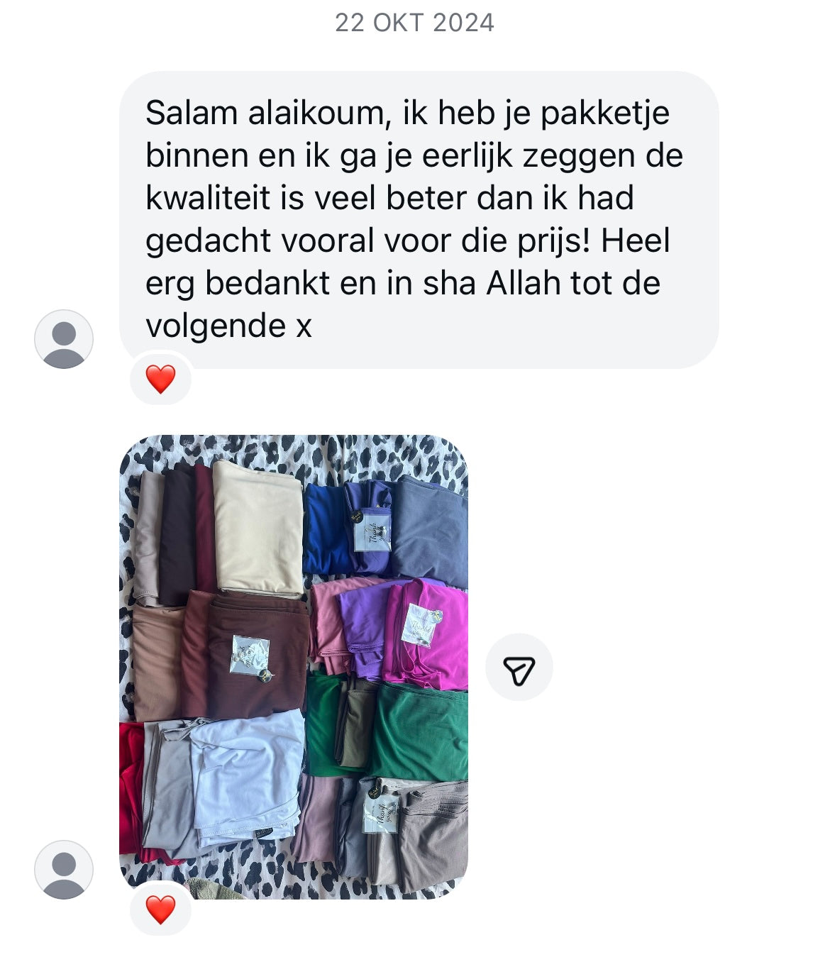 We hebben het pakketje ontvangen, ze is er heel blij mee hamdulillah. De kwaliteit is echt chefs kiss, super bedankt voor alles !!! We gaan zeker nog eens in de toekomst bij je bestellen in sha Allah. -