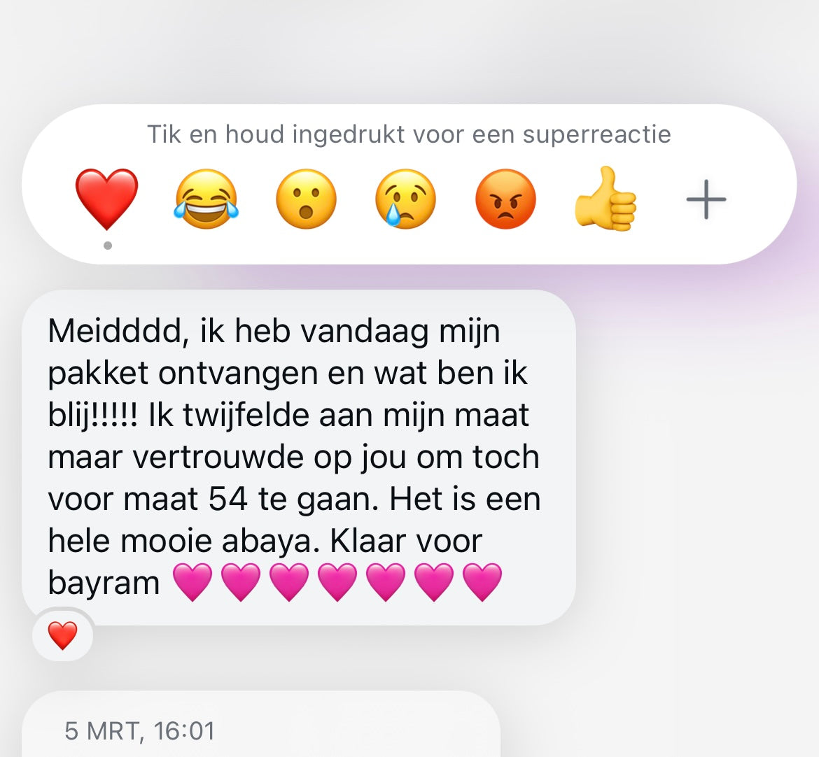 Ik heb mijn bestelling binnen, de jurk valt perfect en de lengte ook! Bedankt voor je snelle reacties en de mooie abaya. De kwaliteit is topppp!!