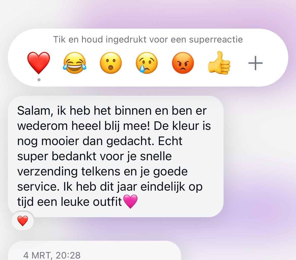 Selamun Aleykum Mijn pakket is aangekomen, ik ben helemaal verliefd op de kleding. Heel erg bedankt!